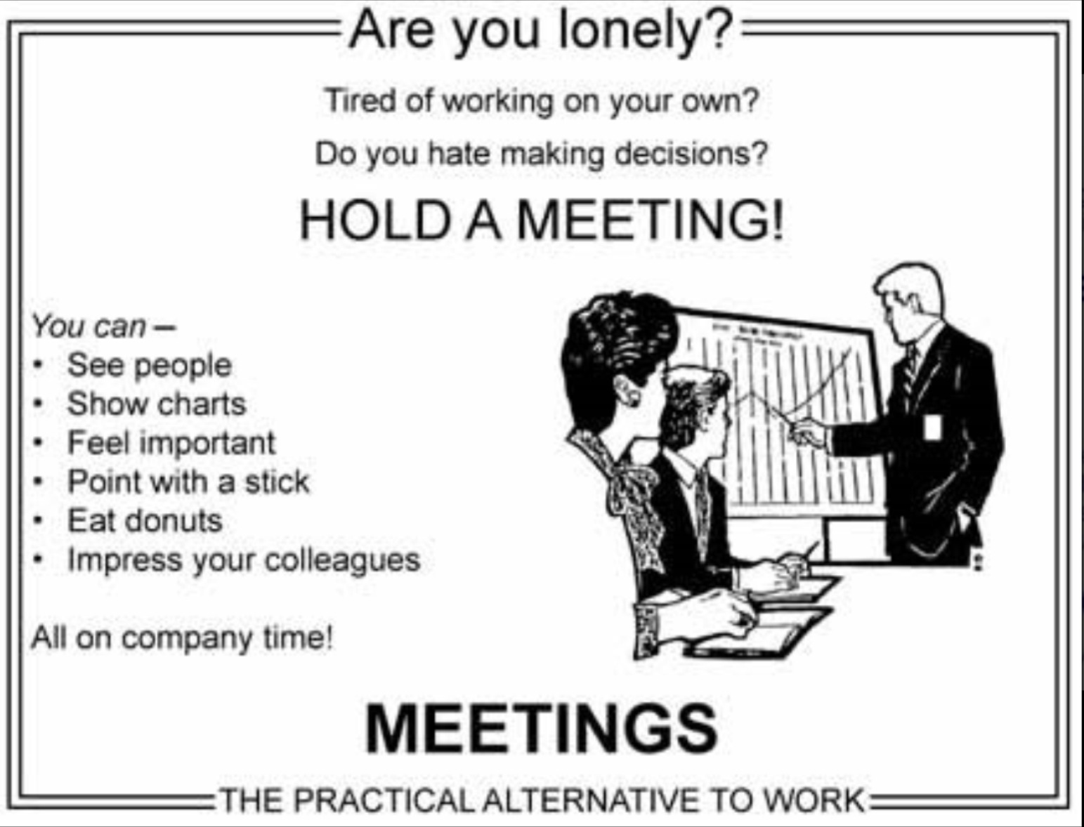 “A meeting is an interaction where the unwilling, selected from the uninformed, led by the unsuitable, to discuss the unnecessary, are required to write a report about the unimportant.” Kayser