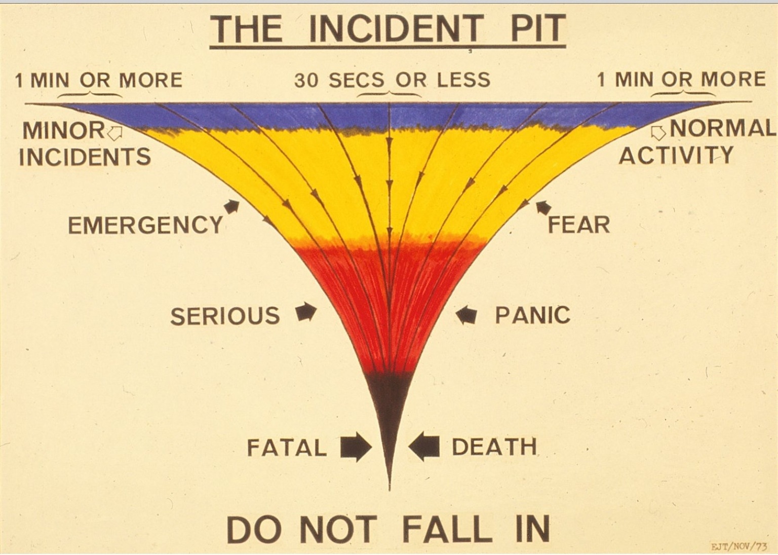 The Incident Pit. This represents my first formal encounter with failure and risk management. The model goes back to 1973 when the concept was presented at the British Sub Aqua Club Diving Officers Conference. It was developed from the evidence gathered from numerous diving accidents (including fatalities) and was part of the diver training I went through in the 1980’s.
