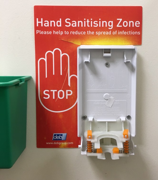 Unfortunately my excitement was premature. I did get to see the hand sanitiser dispenser, but it was redundant. The brightly coloured card was stuck to the wall, a ‘sanitise your hands’ poster above, but no container of germ killing gel underneath. What had gone wrong?