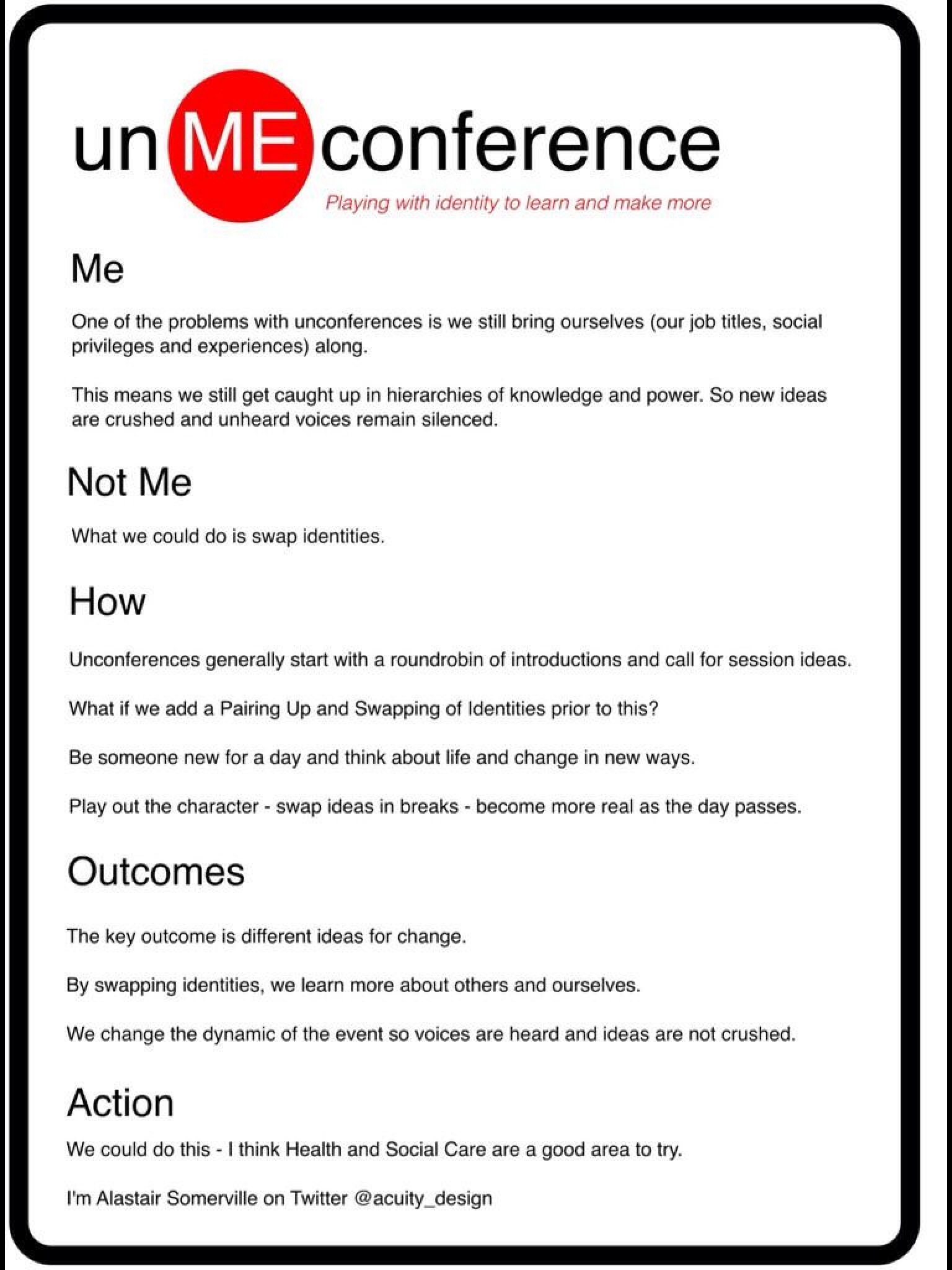 One final thing from Alastair, have a look at this link to un-ME-conferences. A clever idea that you swap your ‘me’ with someone else and become a different identity for the conference. A clever idea that could do a lot to introduce some cognitive diversity and help people get around social privilege. I like it.