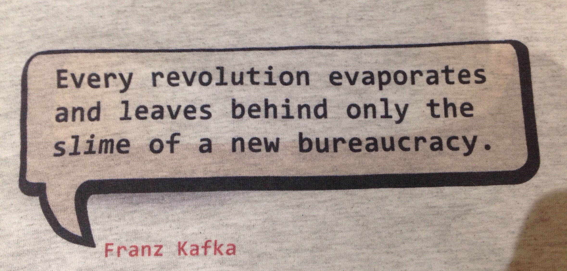 My Kafka T-Shirt – worn to important meetings (under a shirt – obviously!)“Every revolution evaporates and leaves behind only the slime of a new bureaucracy”.
