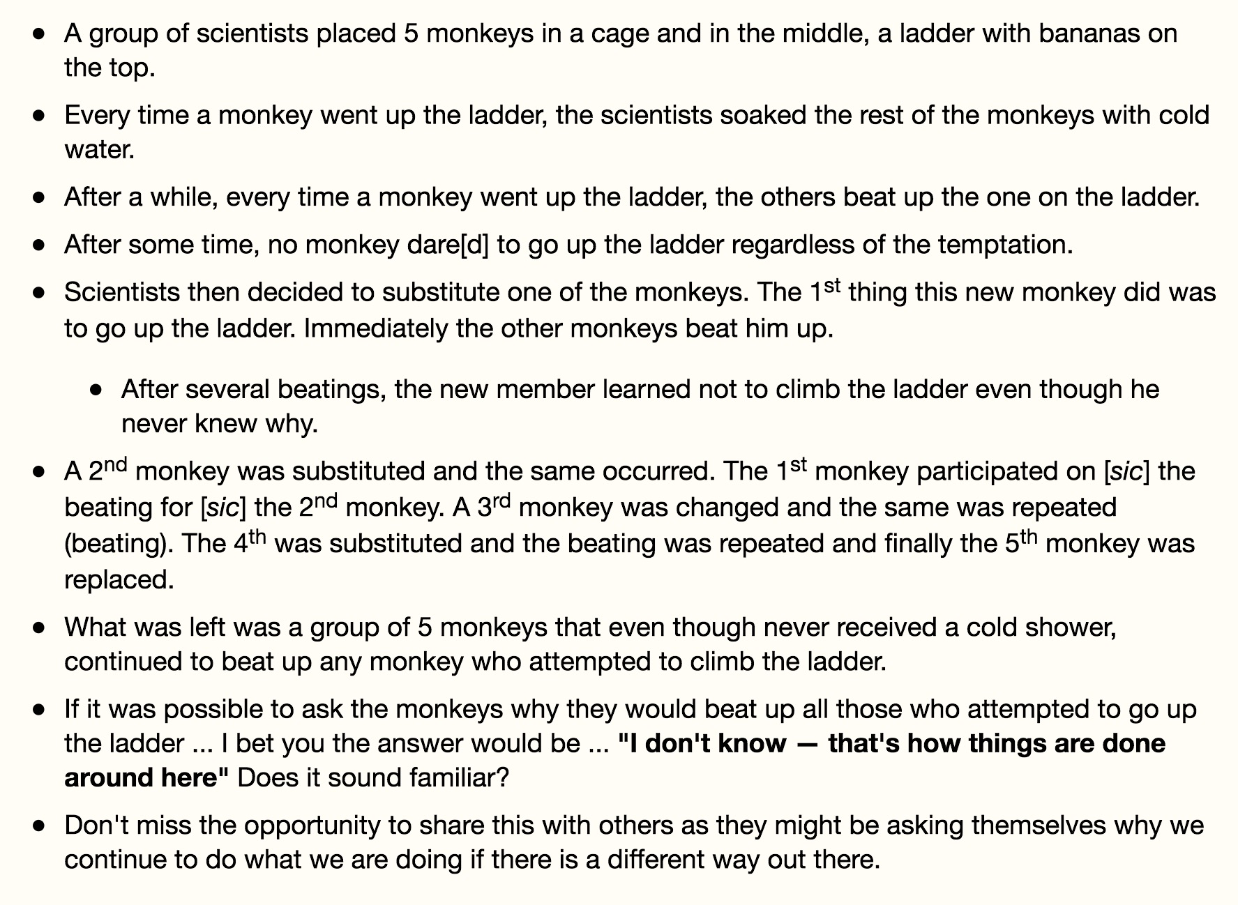 A quick way of explaining the 5 Monkeys Experiment is this graphic.
