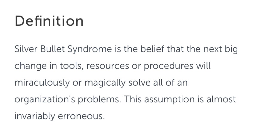 - Over zealous Management Consultants, selling you expensive Silver Bullets you don’t need. Don’t under estimate the power of this one on what happens in organisations.