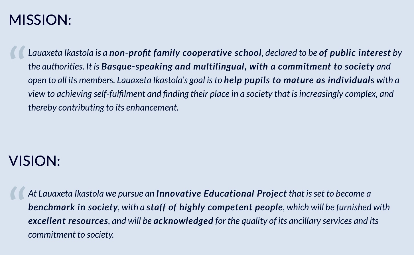 Lauaxeta Ikastola website. Mission, vision and values page.