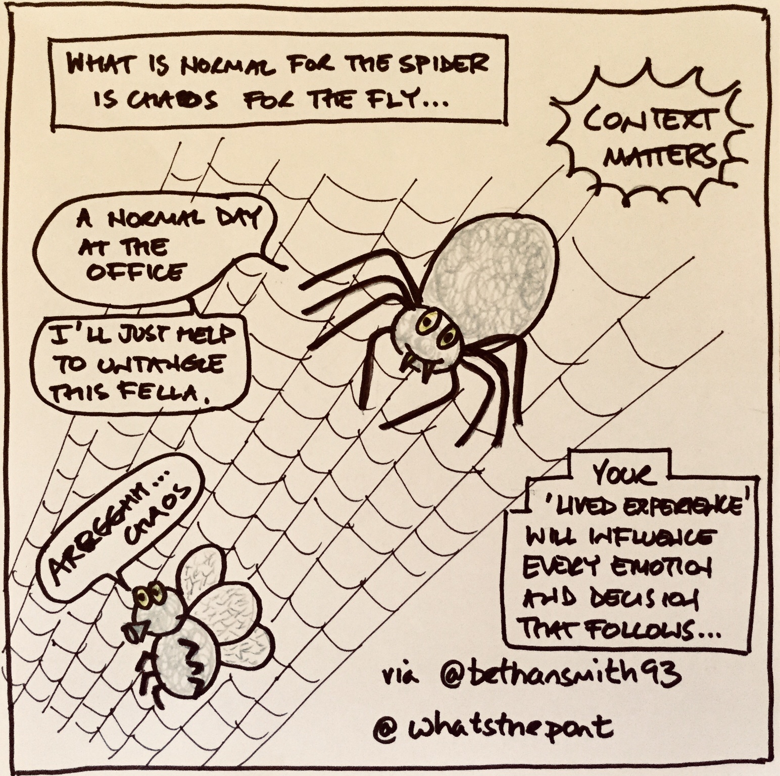 Context is everything. Thanks to Beth Smith (@bethansmith93) for ‘what is normal to the spider is chaos to the fly’, which inspired the illustration above. The quote neatly describes how different experiences of a situation (the context), can massively influence your feelings and also the decisions you make about the situation.