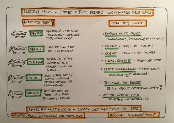 Trojan Mice. Safe to Fail Probes for Complex Problems. I’m hoping this is a fairly self explanatory drawing. The main point is that the more you probe and gather data about complex problems; the better position you are in to make sense of it and make good decisions about what to do next. The more Trojan Mice you deploy, the more data you will get.