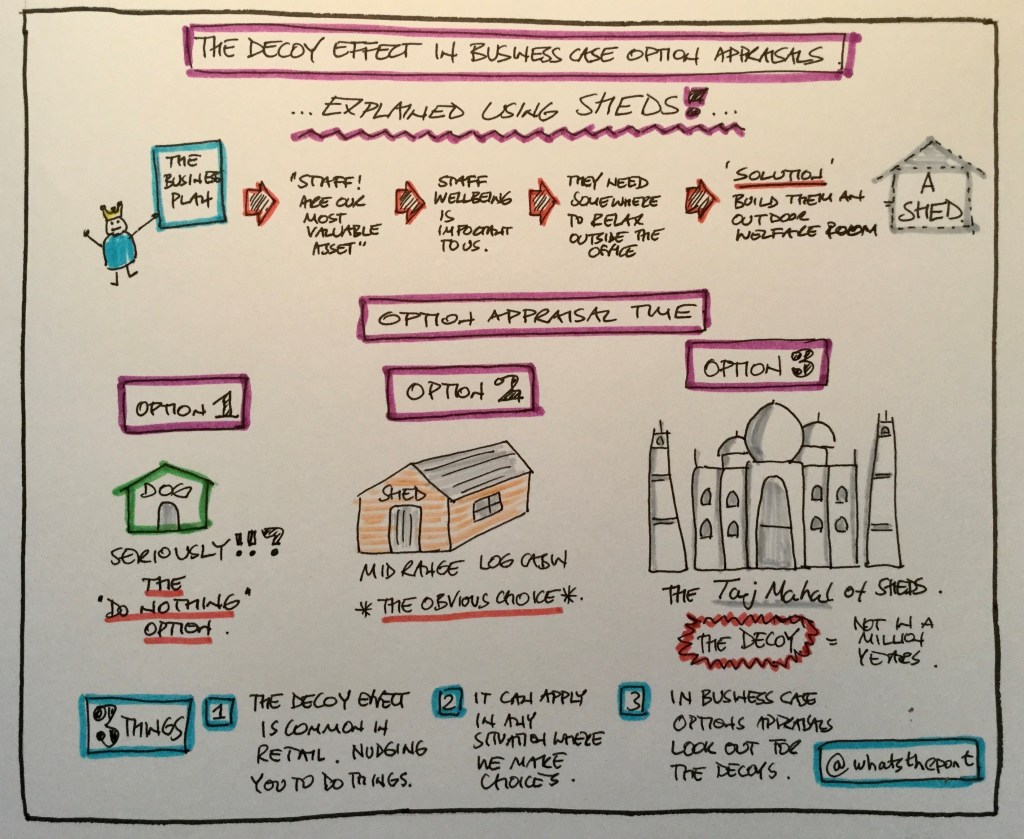 From a personal perspective I’ve gone for something a bit more relatable. Here’s my attempt at trying to explain the Decoy Effect in Business Cases through the medium of Sheds.