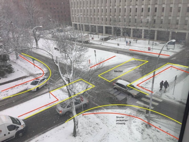 - Snow + Neckdown = Sneckdown. This is brilliant lateral thinking in my view. If you look at the Sneckdowns it gives you a good idea of where neckdowns could ‘naturally’ be placed once the snow has melted.