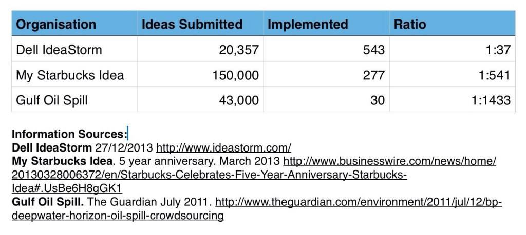 A implementation ratio of roughly 1:1433. Not a great return on investment, for anyone. Maybe it would have been different if there had been lots of little schemes instead of something centrally administered? You can read more on this and my thoughts on crowdsourcing here; ‘You’ve got to move a lot of muck to find the golden nugget’.