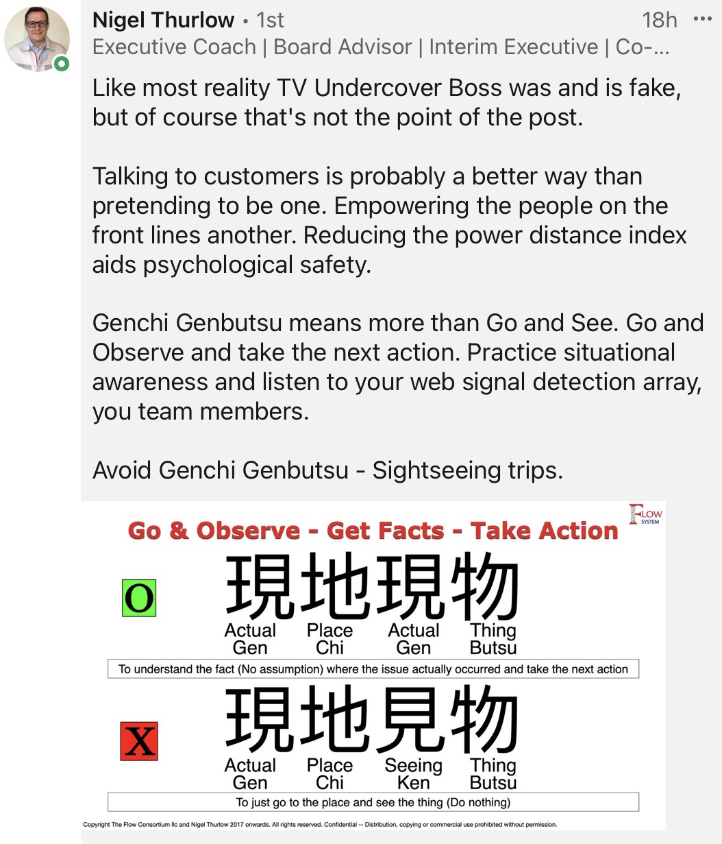 I don’t know the answer to this but – do Toyota have the equivalent of Mystery Shoppers? I’d be interested to know.* (I’ve got an answer Genchi Genbutsu via Complex Wales, see explanation below from Nigel Thurlow, who’s written books about this sort of thing)