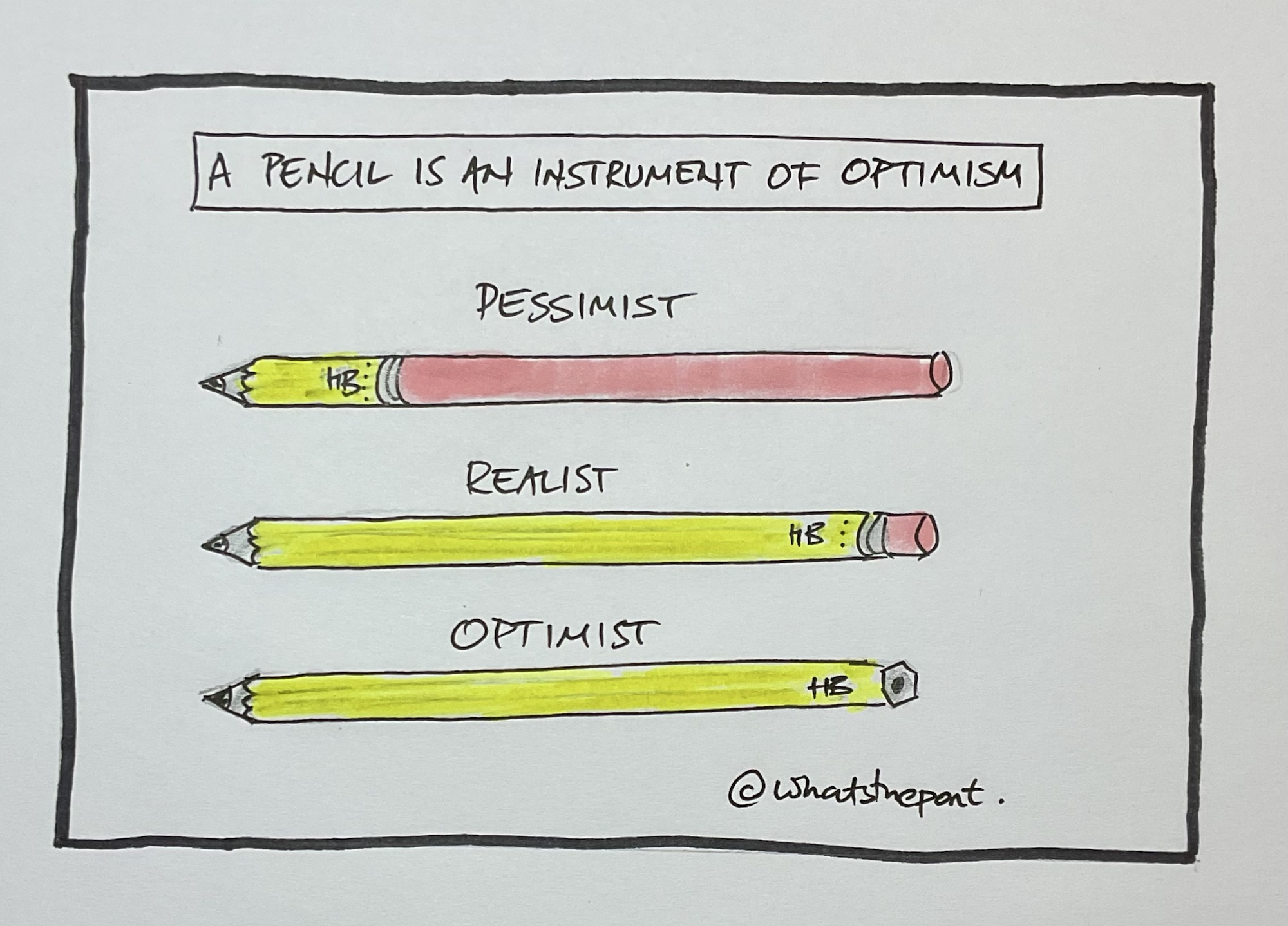 Think about it for a moment. Your average ‘ box fresh’ pencil is over 95% writing material and less than 5% rubbing out / erasing material. If that’s not a instrument of optimism I don’t know what is.