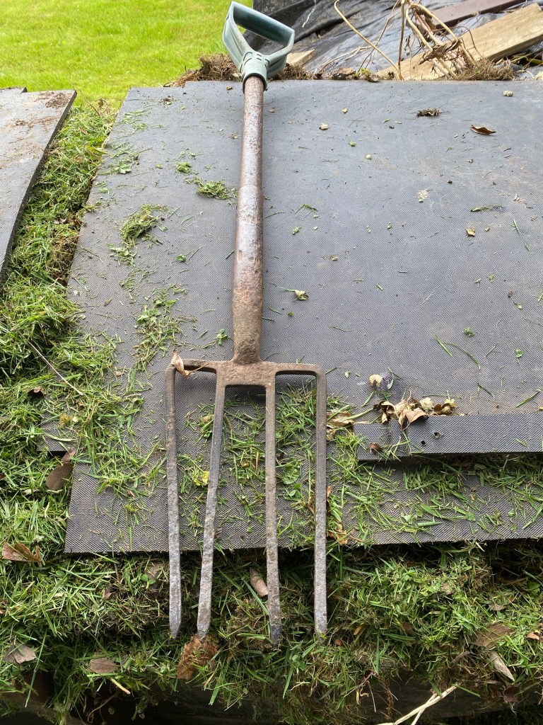 Bushfix fork was quickly cobbled together from the iron body of garden fork I found in the ashes of an old bonfire. A plastic handle salvaged from a broken spade. And some self tapping screws left over from my reclaimed polytunnel project.
