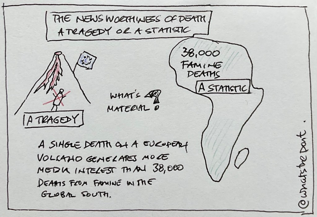 The post was based upon some research into over 30 years of disasters and the medial coverage they generated. Some of the numbers I drew from it was that a single death on a European Volcano generated the equivalent media coverage as 38,000 deaths from famine / food shortages (typically in the Global South).